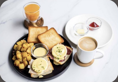 Turkey ham, beef bacon, and poached eggs with hollandaise sauce on toast, Butter, jam, Home fries, Coffee/Tea and Choice of Juice