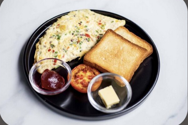 A vibrant omelette with cheese, peppers, onions, and mild green chili, served with toast, butter, and jam